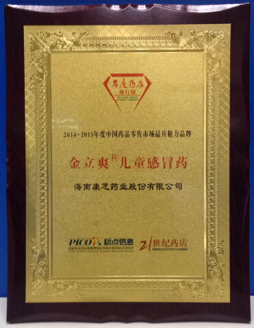 會議首先公布了2014年度中國制藥工業百強榜、中國連鎖藥店綜合實力百強和中國連鎖藥店直營力百強榜并進行了頒獎,康芝藥業金立爽榮膺“2014-2015年度中國藥品零售市場最具魅力品牌”,充分展示了康芝藥業專注兒童大健康產業的品牌魅力以及擁有多個核心產品的市場競爭力??抵ニ帢I金立爽是第三代兒童感冒藥,作為國家質量標準起草單位,一直以最高質量標準引領抗病毒兒童感冒藥的品質。此次“2014-2015年度中國藥品零售市場最具魅力品牌”的殊榮是對康芝藥業金立爽的肯定,彰顯了“金立爽氨金黃敏顆粒”作為最受歡迎兒童抗病毒藥物的品牌魅力。