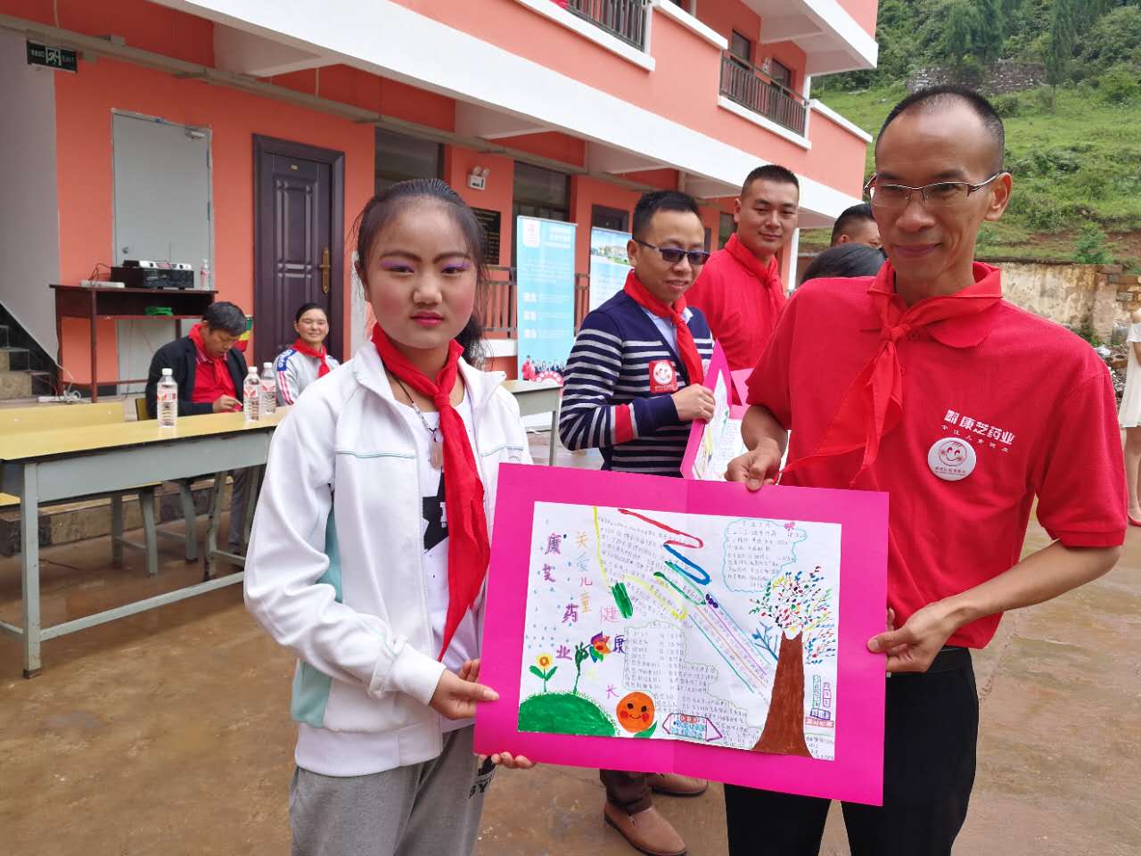康芝藥業(yè)云南省區(qū)經(jīng)理袁代松、康芝藥業(yè)云南合作伙伴曹喜勝,和來自云南銘俊藥業(yè)有限責(zé)任公司、云南彝頌文化傳播有限公司、富源縣旺家樂健康藥房的一眾愛心人士,以及云南曲靖市富源縣后所鎮(zhèn)中心學(xué)校肖松老師、阿依諾小學(xué)全體師生一同出席了捐贈(zèng)儀式。