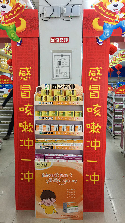 形象店的展示臺(tái)上,有序擺放著康芝松?止咳橘紅顆粒、度來(lái)林?鞣酸蛋白酵母散、金立爽?氨金黃敏顆粒等康芝兒藥系列產(chǎn)品。