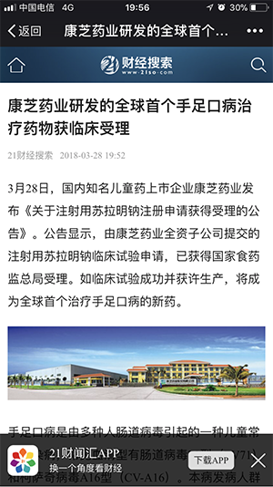 康芝藥業(yè)研發(fā)的蘇拉明鈉治療手足口病新適應(yīng)癥已通過(guò)PCT申請(qǐng)國(guó)際發(fā)明專利,并先后在中國(guó)、日本及新加坡獲得發(fā)明專利授權(quán)。注射用蘇拉明鈉臨床試驗(yàn)一旦成功,有望成為手足口病的克星,為世界兒童手足口病患者帶來(lái)福音。