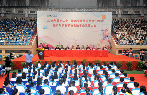11月5日,2018年普寧二中“洪氏獎(jiǎng)教獎(jiǎng)學(xué)基金”頒獎(jiǎng)暨廣州校友聯(lián)誼會(huì)助學(xué)金發(fā)放大會(huì)隆重舉行。康芝藥業(yè)董事長(zhǎng)、廣州普寧二中校友會(huì)會(huì)長(zhǎng)洪江游先生和受邀校友嘉賓,原揭陽市政協(xié)副主席、普寧二中董事會(huì)董事長(zhǎng)張伯利先生,普寧市人民政府方錦屏副市長(zhǎng)及相關(guān)職能部門領(lǐng)導(dǎo),普寧二中師生參加了頒獎(jiǎng)大會(huì)。