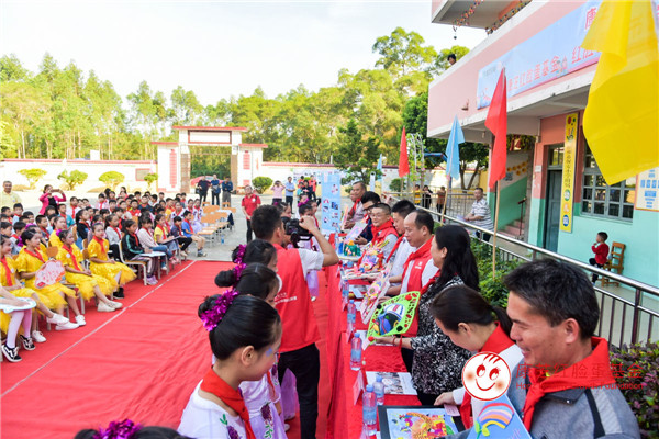 隨后,康芝藥業向卒錦坤校長贈送了“愛心共建學校”牌匾;康芝藥業副總裁李幽泉先生給學校送上了“康芝童心 書香筑夢”、“千秋筆墨驚天地 萬里云山入畫圖”兩幅書畫作品;康芝工會給孩子們帶來了一批體育用品;康芝藥業梧州代理商及診所團隊還給孩子們送上了書包、文具等文體用品。