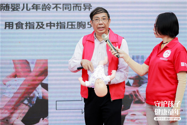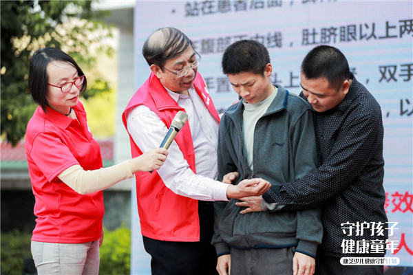 其中,結(jié)合當(dāng)前兒童常見意外情況,丘教授著重給現(xiàn)場(chǎng)孩子家長(zhǎng)講解了如何正確應(yīng)對(duì)兒童氣道異物梗阻狀況。為了讓現(xiàn)場(chǎng)聽眾更直觀地了解“海姆立克”急救手法,丘教授使用了仿真嬰兒進(jìn)行現(xiàn)場(chǎng)教學(xué),此外,還邀請(qǐng)了兩名家長(zhǎng)上臺(tái)進(jìn)行真人示范,確保孩子及家長(zhǎng)實(shí)際掌握到該急救手法。