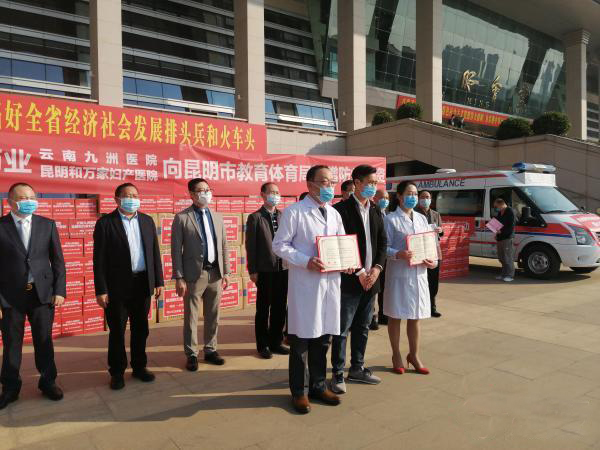 云南九洲醫(yī)院及昆明和萬家婦產醫(yī)院也迅速響應集團的號召,在做好醫(yī)護培訓、預檢分診、院感防控、救護車輛管理等工作外,還先后向防疫一線捐贈醫(yī)用口罩、酒精、消毒液等防疫物資。