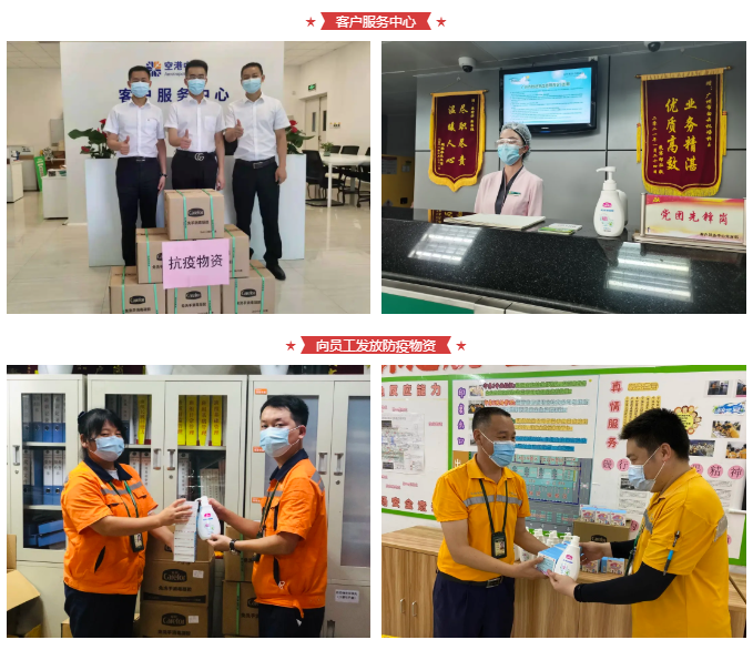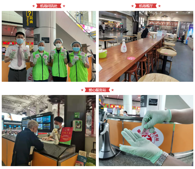 愛護(hù)消毒凝膠物資分別投入至機(jī)場問訊處、防爆點、物流點、機(jī)場餐廳等,以便流動人群隨時清潔消毒使用。同時也向內(nèi)部員工、志愿者和附近酒店統(tǒng)一發(fā)放了防疫物資。