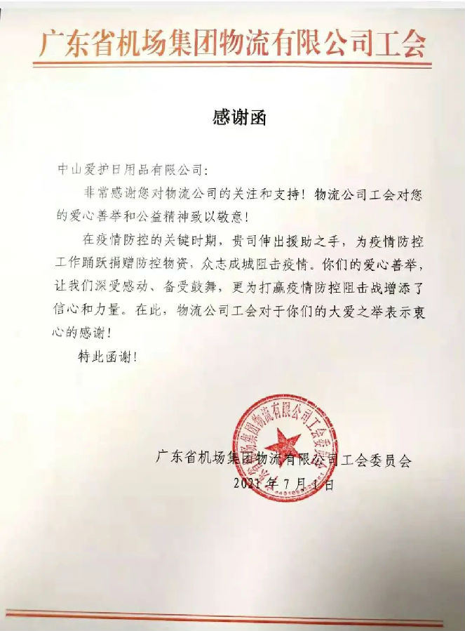 廣東省機(jī)場集團(tuán)物流有限公司工會特此發(fā)來感謝函。眾志成城,阻擊疫情,相信在全體工作人員的共同努力下和社會各界力量的支持下,定能打贏疫情防控阻擊戰(zhàn),筑牢外防疫情輸入的第一道防線。
