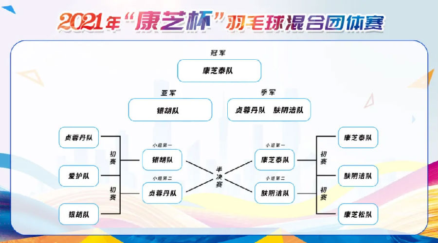 本次比賽共設混雙1、男雙、混雙2三項比賽,均由小組賽及決賽兩部分組成。每項比賽小組賽均采取隨機抽簽分組的形式兩兩對決,按三局兩勝制逐輪晉級進入決賽;兩個小組的第一和第二交叉淘汰賽,兩支勝隊進入總決賽。經(jīng)過激烈的角逐,比賽圓滿落下帷幕。最終,康芝泰隊奪得冠軍,銀胡隊獲得亞軍,膚陰潔隊、貞蓉丹隊并列獲得第三。