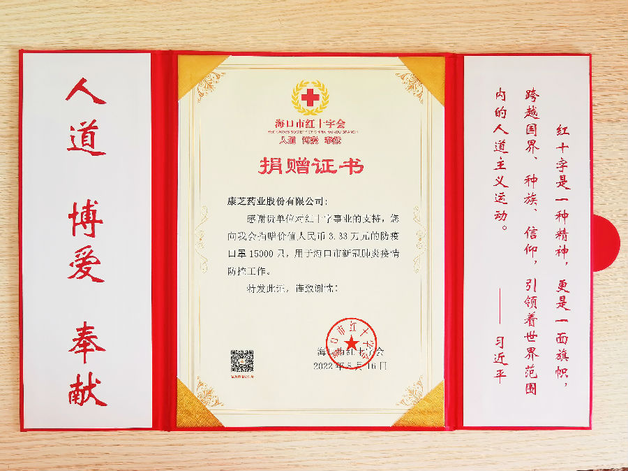 作為一家制藥企業,康芝藥業長期積極關注公益事業,踐行“誠善行藥,福澤人類”的企業宗旨,積極回饋社會,履行企業社會責任。自疫情發生以來,康芝藥業勇于擔當,作為海南首條醫用口罩生產線的生產企業,時刻嚴把防疫物資產品質量關,全力保障疫情防控所需,同時也積極承擔上市藥企的社會責任,支援社會各界做好疫情防控工作。