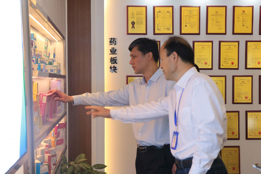 在高洪常總經(jīng)理的帶領(lǐng)下,江西省贛州市副市長鄒治宇參觀了康芝藥業(yè)展廳,深入了解康芝藥業(yè)的發(fā)展歷程、明星產(chǎn)品以及研發(fā)實力等。