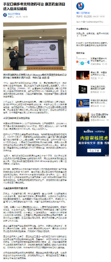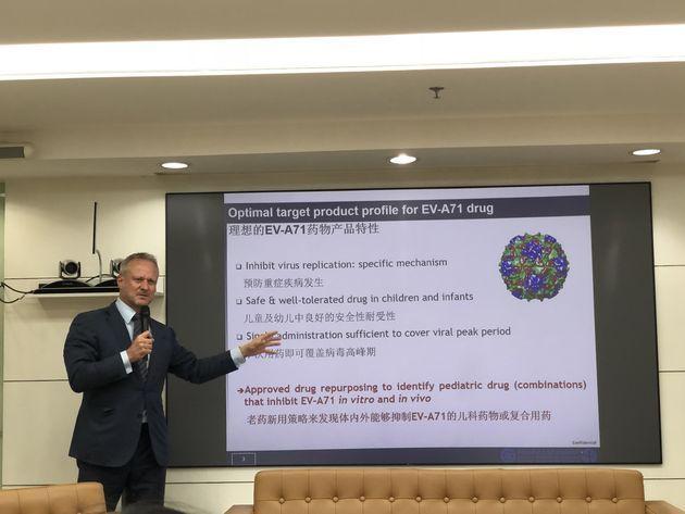 2015年,康芝藥業引進中法合作中科院上海巴斯德研究所的“治療病毒疾病的成分和方法”專利技術,著力研發兒童手足口病專用抗病毒藥物注射用蘇拉明鈉,Ralf Altmeyer教授作為發明人參與其中。近日,康芝藥業全資子公司收到國家藥品監督管理局下發的“注射用蘇拉明鈉”藥物臨床試驗批件。如果臨床試驗成功并獲許生產,蘇拉明鈉將成為全球首個治療手足口病的新藥。